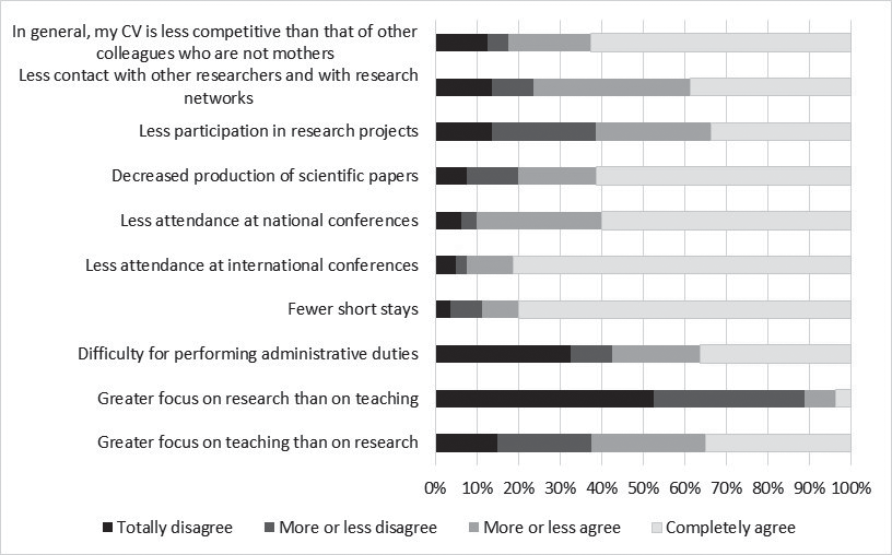 Most of the respondents considered that being a mother implied a less competitive curriculum compared with co-workers that are not mothers, although 18% of them did not agree or totally disagreed with this assumption. Mobility is seen as the main handicap, related to difficulties for attending international and even national conferences, or for doing field work or accepting short stays. The results suggest that women academics that are mothers focus more on teaching than on research. In this context, more than thirty years ago, a study by Cole and Zuckerman (1987) showed that married women with children published no fewer papers than married women without children and that older eminent women with children generally published as much early in their careers as their unmarried counterparts did, accepting that married women scientists with children paid a price to remain scientifically productive. Other authors show that family-related variables, such as having dependent children, have little or no effects on research productivity for full-time men and women teachers (Sax et al., 2002; Aiston & Jung, 2015).