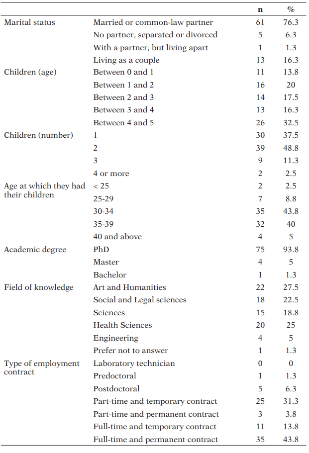 Table 1 shows the demographic data of the respondents. 76% of participants were married or had a common-law partner. 37% had 1 child and 49% had 2 children. The sample by age of the children was balanced: 14% had children aged under 1 year; 20% aged between 1 and 2; 17% between 2 and 3, 16% between 3 and 4, and 32% between 4 and 5. 84% had their children when they were 30 to 39 years old.