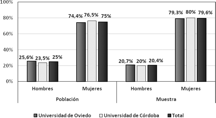 El estudio de la población, determina la necesidad de una muestra de 1.863 personas (939 de Oviedo y 924 de Córdoba), para trabajar con un nivel de confianza del 99% y un margen de error del 3%. El procedimiento de recogida de información garantiza la participación del alumnado que, por otra parte, se muestra muy colaborativo y se implica agradeciendo la oportunidad de expresar sus valoraciones y demandas. Los resultados permiten verificar la adecuada correspondencia entre la población y la muestra real generadora de datos, en función de la Universidad, Grado y sexo (Gráfico 1).