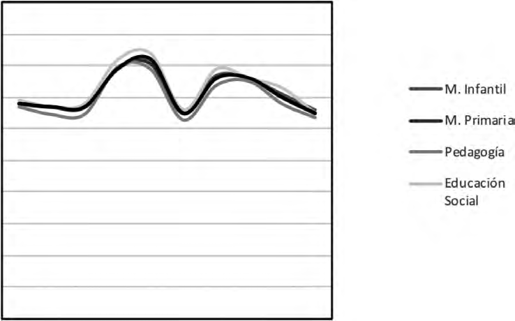 El análisis diferencial muestra una sorprendente coincidencia de posturas entre los alumnos de los distintos Grados: la correspondencia de las líneas de medias es casi exacta en todas las titulaciones, independientemente de que se estén impartiendo en Oviedo o en Córdoba. No hay ninguna diferencia significativa en función del Grado y las posturas de los alumnos son convergentes en los 6 Grados —2 de Maestro de Infantil, 2 de Maestro de Primaria, 1 de Pedagogía y 1 de Educación Social— (Gráfico 4).