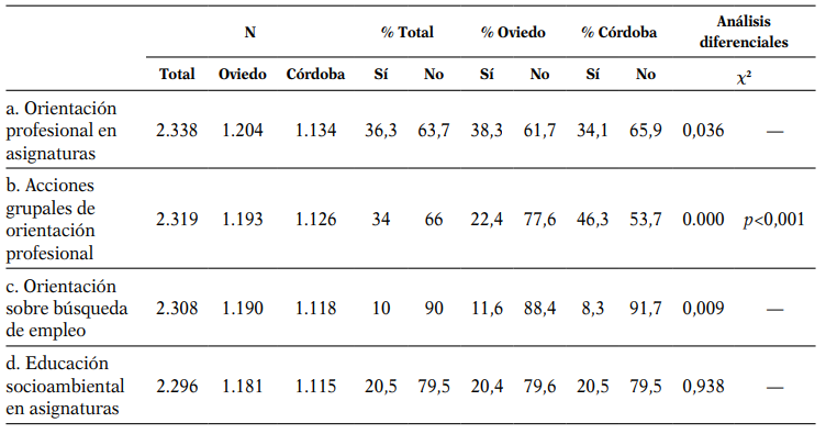 El contraste estadístico indica posturas más críticas de los estudiantes de Oviedo, con medias un poco más bajas (orientación para el desarrollo de la carrera en las asignaturas 5,4, educación socioambiental 5,6, y acciones grupales 5,8), que entre los de Córdoba (6,1, 6,3 y 6,7, respectivamente) (p < 0,001).