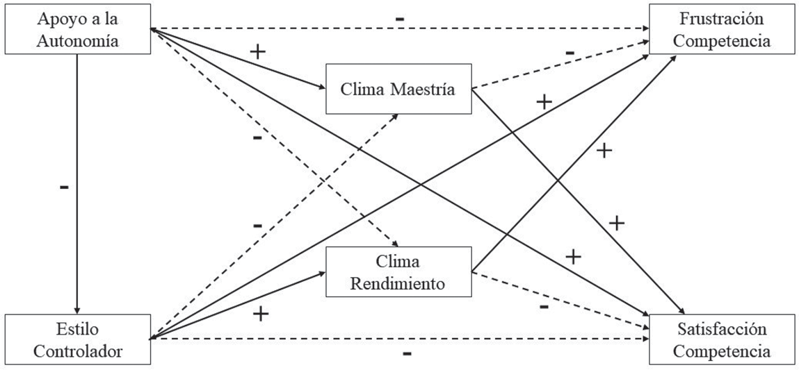 Las relaciones entre los factores del estilo docente (i.e., apoyo a la autonomía y estilo controlador) y la satisfacción y frustración de la competencia académica, así como las relaciones entre los factores del estilo docente y los mediadores (i.e., clima motivacional hacia la maestría y clima motivacional hacia el rendimiento), y entre los mediadores y la frustración y satisfacción de la competencia académica, se pueden comprobar en la Figura 2 y en la Tabla 2.
