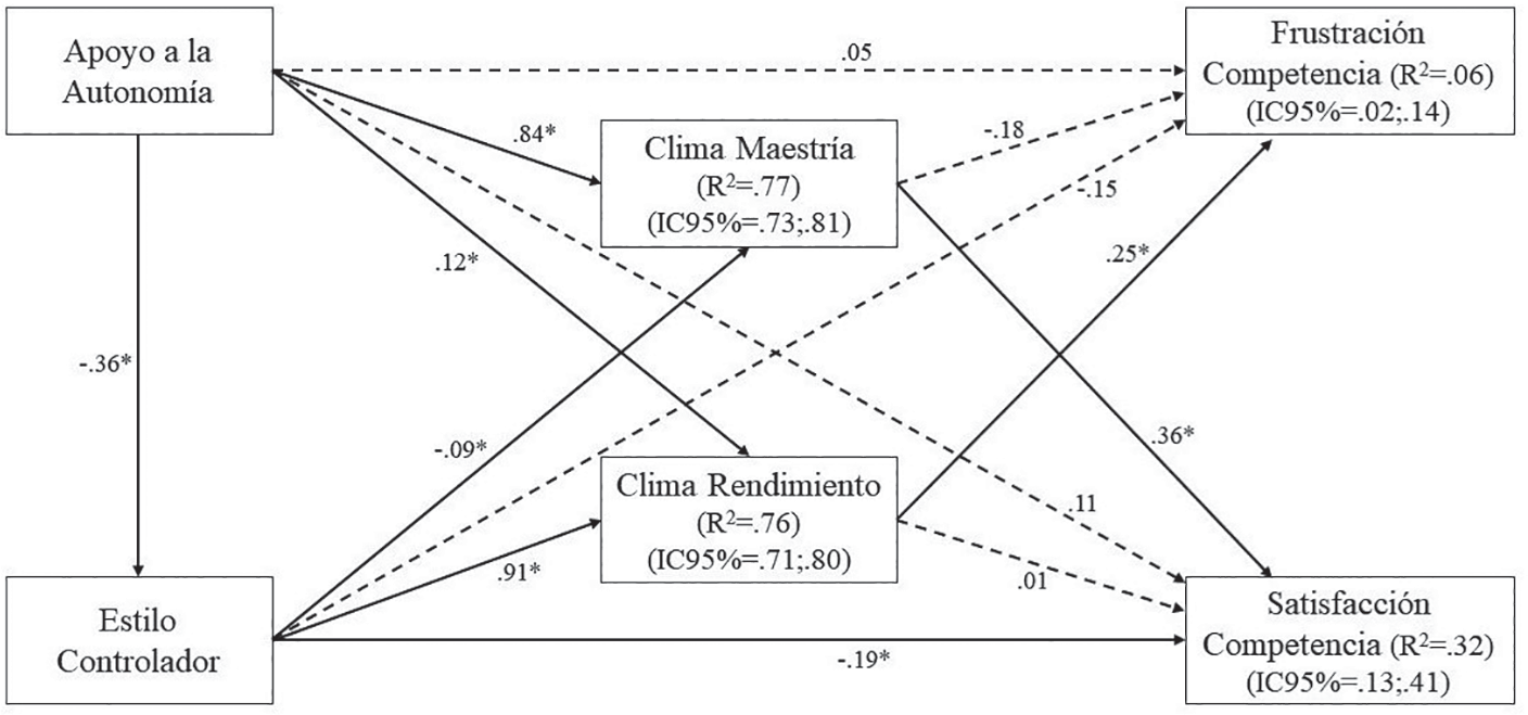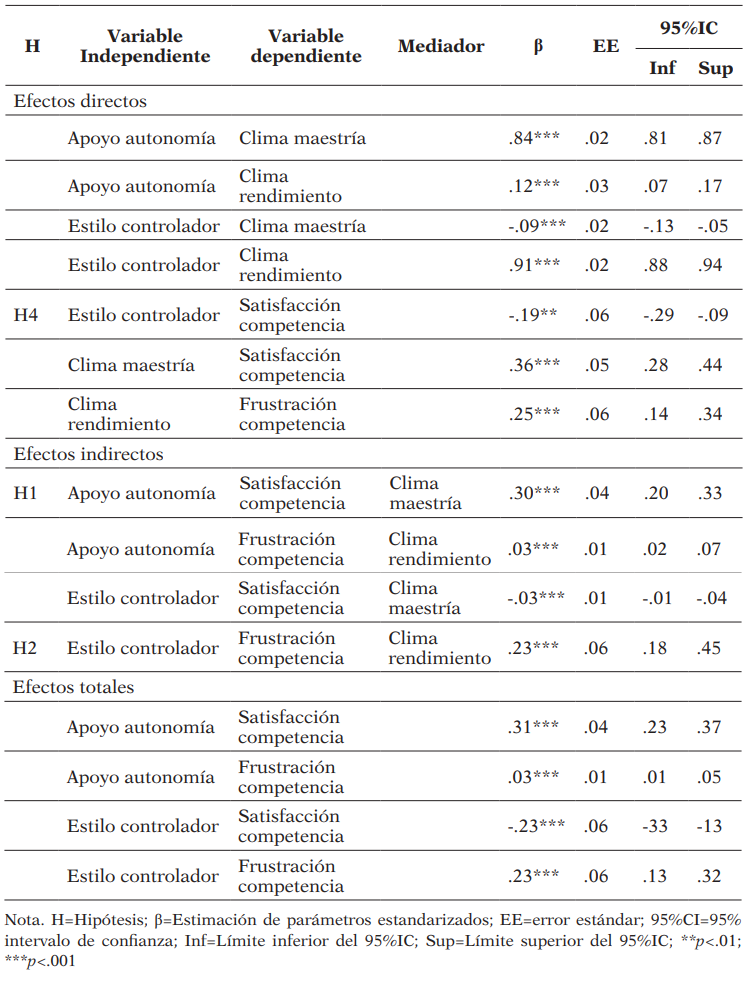 El modelo hipotetizado, en el que la percepción del estilo interpersonal docente predice la satisfacción y frustración de la competencia, actuando el clima motivacional percibido como mediador, presentó un buen ajuste: χ2/gl=2.96, p=.004; CFI=.989; TLI=.975; RMSEA=.075 (90%CI=.039;.113), SRMR=.047. El modelo alcanzó un 32% de varianza explicada en la satisfacción de la competencia académica, un 6% en la frustración de la competencia académica, y el 76% y 77% en el clima motivacional hacia la maestría y el clima motivacional hacia el rendimiento, respectivamente.