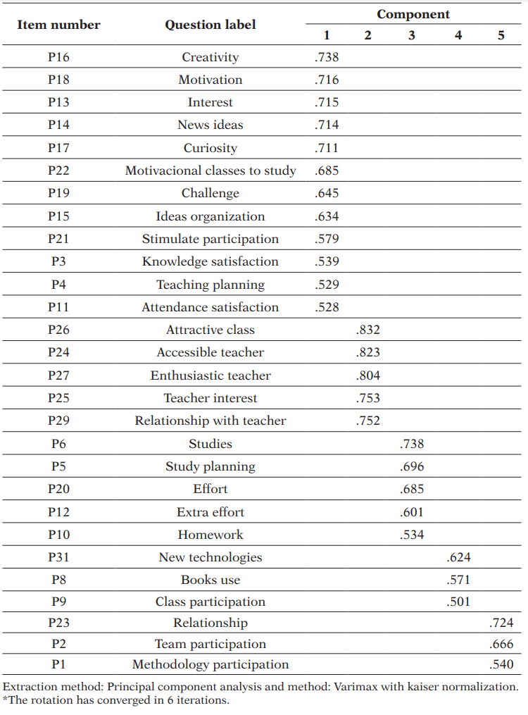 The initial eigenvalues (Table 4) indicated the extraction of five factors that would explain 58.57 % of the variance. Finally, the rotated component matrix (Table 5) showed that the variables P16, P18, P13, P14, P17, P22, P19, P15, P21, P3, P4, and P11 displayed correlations (with values ranging from .738 to .528) with Factor 1 (motivation, which also included questions on emotion and cognition); variables P26, P24, P27, P25, and P29 (from .832 to .752) with Factor 2 (professor); variables P6, P5, P20, P12, and P10 (from .738 to .534) with Factor 3 (behaviour); variables P31, P8, and P9 (from .624 to .501) with Factor 4 (resources); and variables P23, P2 and P1 (from .724 to .540) with Factor 5 (relationship).