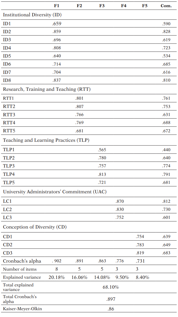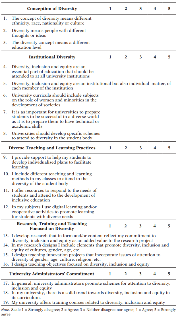 The factorial results provide a concise, validated scale made up of 19 items and five denominating factors: Institutional Diversity; Research, Teaching and Training Focused on Diversity; Diverse Teaching and Learning Practices; University Administrators’ Perceived Commitment to Attention to Diversity; and Conception of Diversity.