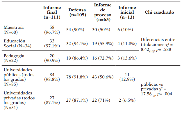 Esta distribución de tipologías de TFG es significativamente diferente entre las universidades públicas y privadas, de manera que en las universidades públicas se ofrece un abanico significativamente más amplio de opciones de tipologías de TFG que en las privadas (χ² = 15.50(4), p= .004). Sin embargo, no existen diferencias entre las tres titulaciones en la distribución de la tipología de TFG (χ² = 4.37(8), p= .823).