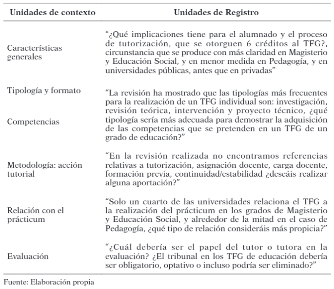 Tras el análisis de las guías docentes, se generó un espacio de discusión académica con personas responsables de la coordinación y/o estudio del TFG en torno a los resultados obtenidos. Este análisis permitió supervisar la validez de contenido de los resultados, para lo cual se remitió a los participantes del grupo de discusión, previo a la realización del encuentro virtual, un breve informe de resultados mostrando la frecuencia de las unidades de registro en las distintas unidades de contexto (recogidas en Tabla 2).
