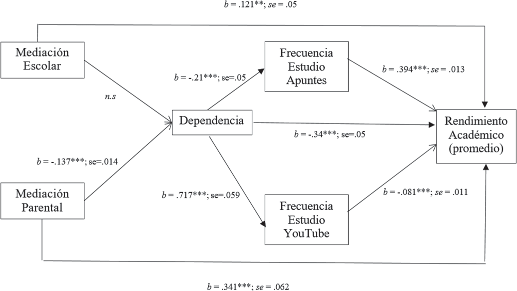 Respecto a las hipótesis propuestas, la Figura 1 muestra el impacto positivo de la mediación parental (b=.341, SE = .062, p <.001) y escolar (b=.121, SE=.05, p≤0.01), corroborando H1a y H2a respectivamente. Siguiendo de izquierda a derecha el modelo, si bien los estudiantes que perciben una mayor mediación parental respecto al uso de tecnologías presentan una menor dependencia digital hacia las tecnologías, corroborando H1b (b=.341, SE=.062, p<.001), la mediación escolar no tiene una significación estadística en el modelo, a pesar de estar correlacionados, como se ve en la Tabla 3.