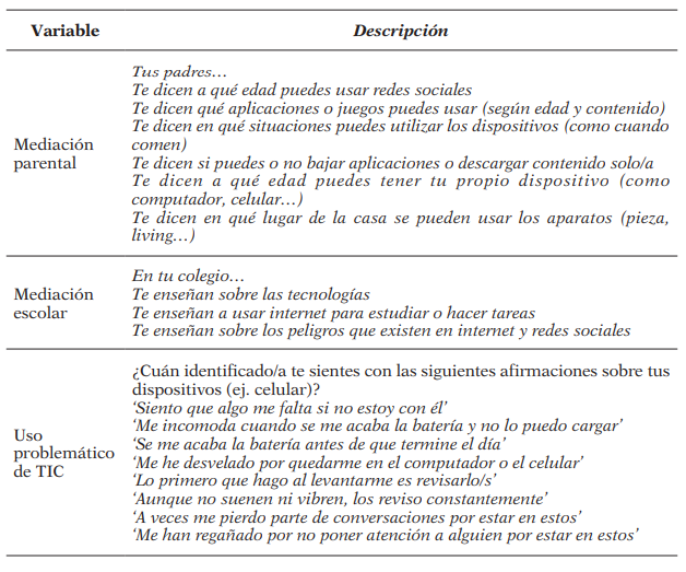 Tomando las normas (Liu et al., 2012) y mediación parental percibida por los estudiantes (Berríos-Valenzuela et al., 2015), se consideraron seis aspectos de mediación: la edad de uso de redes sociales y dispositivos propios, los lugares de la casa y situaciones en que los utilizaban —ej. comidas—, además de las aplicaciones y contenido que podían utilizar (M=.34; DS=.23; α=.61).