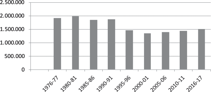 Se evidencia una primera tendencia de incremento de la matrícula, la cual alcanza su punto máximo en el curso 1980-81 con casi dos millones de alumnos (1.985.439). A partir de ese momento, la orientación cambia llegando a su punto más bajo dos décadas después, con la pérdida de un tercio de la matrícula en números redondos, 32.42%, porcentaje muy considerable. La situación se frena con el cambio de siglo y experimenta un suave crecimiento, de tal modo que las cifras del curso 2016-17 muestran un incremento del 11.58% con respecto al 2000-01.