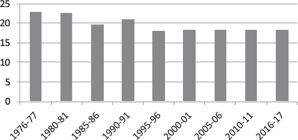 Las cifras nos señalan una ligera tendencia a la baja, con una estabilización desde mediados de la década de 1990. El alumnado pasa del 22.93% del total en el curso 1976-77 al 18.40% cuatro décadas después, un descenso significativo de 4.5 puntos el cual se produjo en el último cuarto del pasado siglo. Desde entonces se ha mantenido estable. Tal evolución casa bien con lo señalado en la Figura 1. Siguiendo con el análisis del alumnado, hemos creído oportuno complementar lo señalado, con una comparativa en la Figura 3 entre los porcentajes de los matriculados en los centros de EC y en el conjunto de los colegios privados.