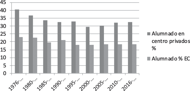Como se puede observar, el porcentaje del alumnado de los centros privados también ha seguido una tendencia a la baja. Desde un destacado 40.41% en el curso 1976-77 hasta el 29.36% en el 2000. Posteriormente, ha ido creciendo llegando en el 2016-17 al 32.52%, perdiendo en estas cuatro décadas 7.89 puntos. En cuanto a la matrícula de EC también ha sufrido un descenso de 6.53 puntos. En general sus datos presentan menos altibajos, sobre todo a partir del curso 1995-96. Desde ese momento hasta la actualidad ha oscilado entre el 18.09% y el 18.43% de la matrícula total. En el último curso atendió al 56.58% del alumnado de los centros privados, porcentaje prácticamente similar al 56.74% que presentaba hace cuatro décadas.