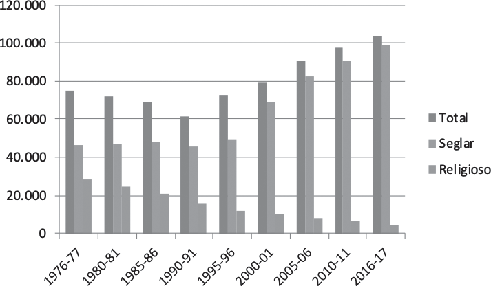 Sin duda, el aspecto más relevante lo presenta la relación entre profesorado seglar y religioso. Este último ha ido reduciéndose drásticamente, de tal modo que los 4625 del curso 2016-17 representan solo el 16.40% de los que lo hacían cuatro décadas antes. Una intensa pérdida de más de 83 puntos y que, a diferencia de lo ocurrido con el alumnado, no sufre ningún cambio de tendencia. Todo lo contrario sucede con el profesorado seglar que en el mismo periodo aumenta un 112%.