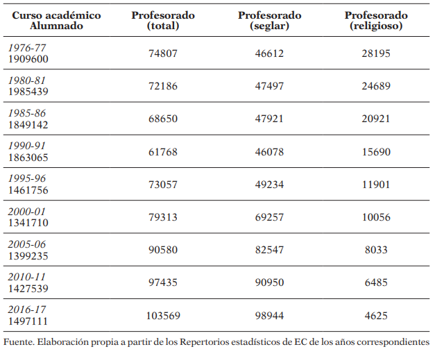 Para comprender en toda su extensión esta profunda modificación, debe tenerse en cuenta que en el curso 1976-77 el profesorado religioso suponía el 37.69% del conjunto de los claustros, mientras que cuatro décadas después solo llegaba al 4.67%. Desde otra perspectiva, según el repertorio del curso 2016-17 se contabilizaban 2587 colegios vinculados a EC, lo que supone una media de 1.78 de religiosos o religiosas por centro. Cifra muy exigüa, lo que ya desde los años 90 había llevado a algunas órdenes a sopesar la posibilidad de cerrar colegios (Alvira, 2017).