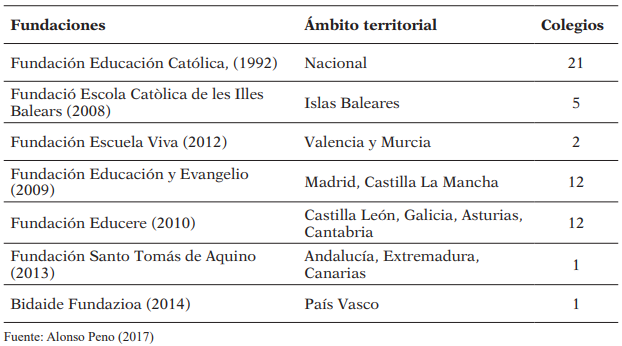 En el caso de las fundaciones, podemos identificar una triple tipología. De un lado, las creadas por las congregaciones para atender sus propios centros. A las ya citadas de los jesuitas y marianistas, podemos sumar, entre otras, la de las escolapias, (“Quiénes somos”, 2020a) o la de las Esclavas del Sagrado Corazón (Fundación Educativa ACI, 2020).