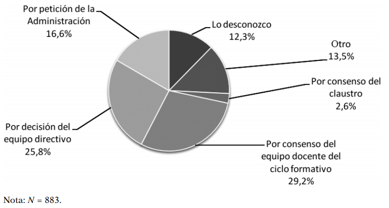 En cuanto al proceso de implementación de la FPD, la Figura 1 recoge los agentes de la toma de decisión, según el profesorado (la pregunta admitía solo una opción de respuesta, recogiendo los agentes principales que determinaron la implementación): consenso del equipo docente, o decisión del equipo directivo del centro. El profesorado participante menciona otras vías de decisión, entre las que destacan el consenso entre varios actores (equipo directivo, docente, Administración, empresas), en el 6% de los casos, y la petición por parte de empresas, sectores y asociaciones empresariales en el 4,4% de los casos.