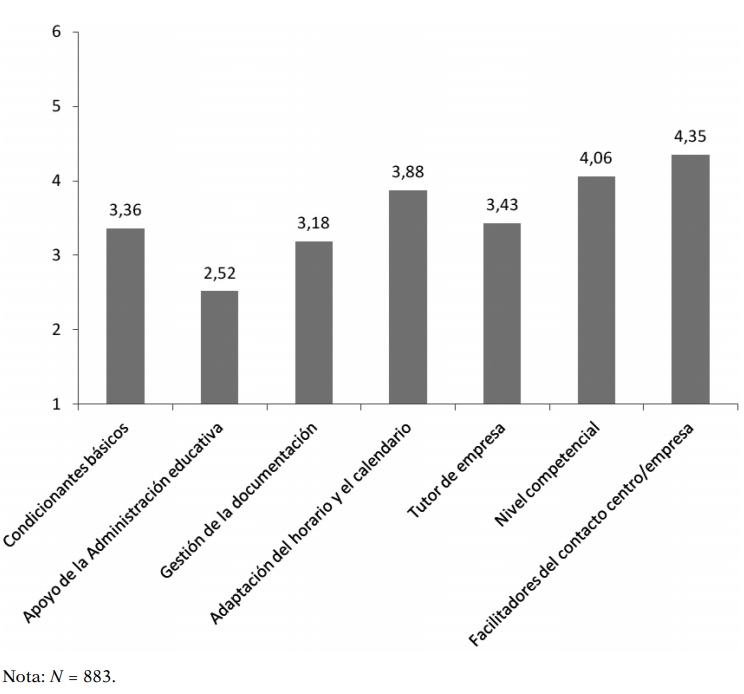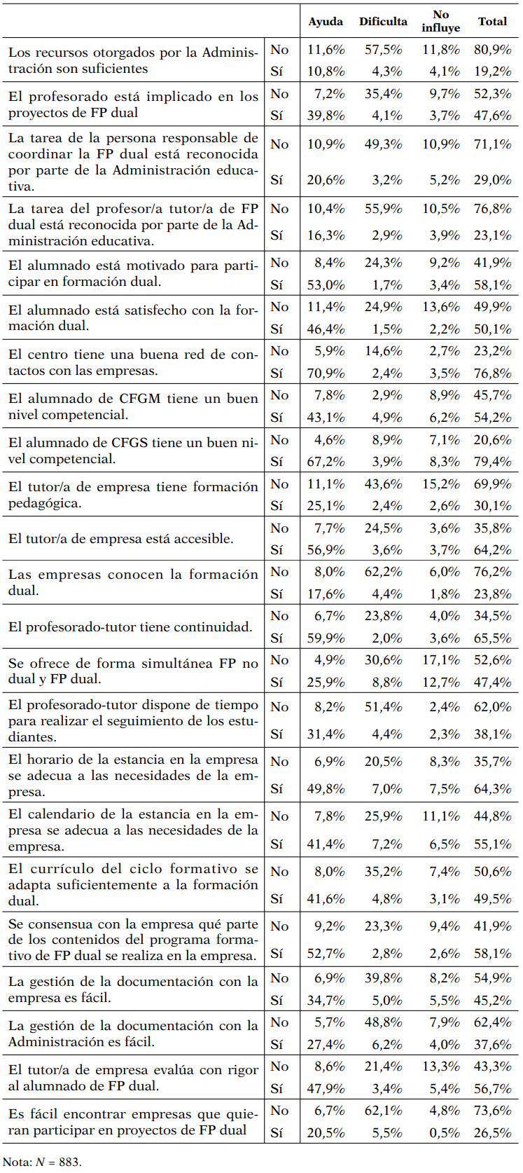 En cambio, las afirmaciones con las que menos está de acuerdo el profesorado participante en el estudio son: «Los recursos que la Administración otorga al centro educativo para realizar FP dual son suficientes»; «La tarea del profesor/a tutor/a de FP dual está reconocida por parte de la Administración educativa»; «Las empresas conocen la formación dual», y «Es fácil encontrar empresas que quieran participar en proyectos de FP dual». A su vez, estos elementos constituyen las principales dificultades según el profesorado encuestado, junto con el tiempo disponible del tutor/a para realizar el seguimiento del alumnado y la gestión de la documentación con la Administración educativa.