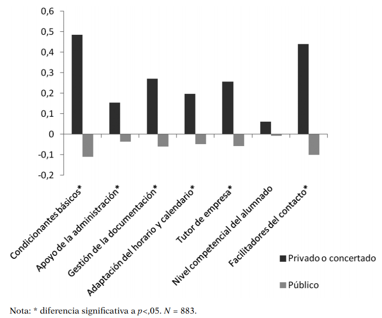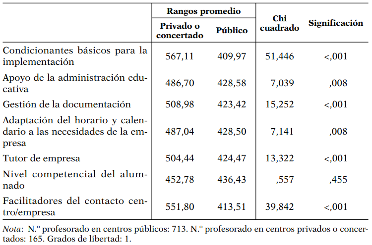 Con la finalidad de ahondar más en las precepciones de los profesionales educativos, el estudio analiza las diferencias en función de la titularidad del centro; ello responde a la voluntad de verificar una precepción social detectada en los agentes educativos (Pineda, Fernández de Álava y Espona, 2018): los profesionales de los centros concertados y privados pueden tener una visión más positiva de la FP dual que los profesionales de centros públicos.