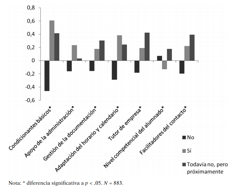 Siguiendo con las diferencias encontradas entre la percepción del profesorado que imparte docencia en centros formativos donde ya se está implementando la FPD, y el profesorado de centros que solo imparten formación no dual, los resultados sugieren que los primeros tienen una percepción más positiva de los factores condicionantes en relación al desarrollo de los proyectos de FPD. El diseño de esta investigación no nos permite saber si los factores están mejor valorados porque el profesorado tiene ya una experiencia en FPD y ha visibilizado sus beneficios y relativizado sus dificultades; o bien, al contrario, si se implementa la FPD en esos centros justamente porque están más preparados para afrontar este reto. En este sentido, sería conveniente para futuras investigaciones plantear un diseño longitudinal prospectivo, para poder establecer la relación entre estas variables en términos de antecedentes y resultados. Además, se observa que en los centros donde la FPD se implementará próximamente, el profesorado expresa valoraciones parecidas, sugiriendo que la implementación se fundamenta en unos condicionantes favorables: motivación del alumnado, implicación del profesorado, apoyo por parte de la Administración, una adaptación del calendario compatible con las empresas colaboradoras, facilidades en el contacto con las empresas, etc.