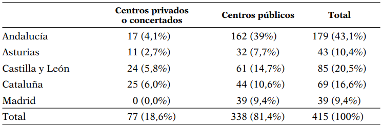 Finalmente, después de la recogida de datos y de la depuración de los mismos, la muestra productora de datos se concretó en 415 centros pertenecientes a las cinco Comunidades Autónomas (ver Tabla 1). Los participantes finales fueron los 415 directores/as de los centros educativos, y 883 miembros del profesorado (474 tutores de prácticas de FP, 135 de FPD, 163 coordinadores de prácticas de FP y 111 de FPD).