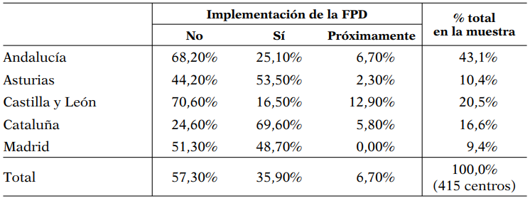 En la Tabla 3 se presenta la distribución de los centros por Comunidades Autónomas (CCAA), indicando el estado de implementación de la FPD. Puede observarse que la comunidad autónoma más representada en la muestra es Andalucía, con un 43,1% de los centros educativos, reflejando la distribución de la población. La Comunidad de Madrid está infrarepresentada, debido a la inferior tasa de respuesta de los centros, respecto a otras CCAA. Más de la mitad de los centros encuestados (el 57,3%) no está ofreciendo grados de FPD, mientras que un 35,9% ya está implementando esta modalidad de FP. Finalmente, se observan diferencias en la distribución de los centros, dentro de cada CCAA, según el estado de implementación de la FPD: siendo Cataluña la submuestra con más presencia de centros donde ya se está realizando, y Castilla y León donde menos.