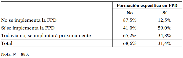 En la Tabla 4 se puede observar que más de dos terceras partes del profesorado de la muestra no se han formado en FPD. El porcentaje de profesorado que sí ha recibido formación específica es mayor en los centros donde ya se está implementando, aunque siguen siendo poco más de la mitad los que se han formado. El análisis de las acciones formativas mencionadas revela que la formación más frecuente es de carácter general e introductorio, con una duración media de 10 horas y que frecuentemente representa una jornada.
