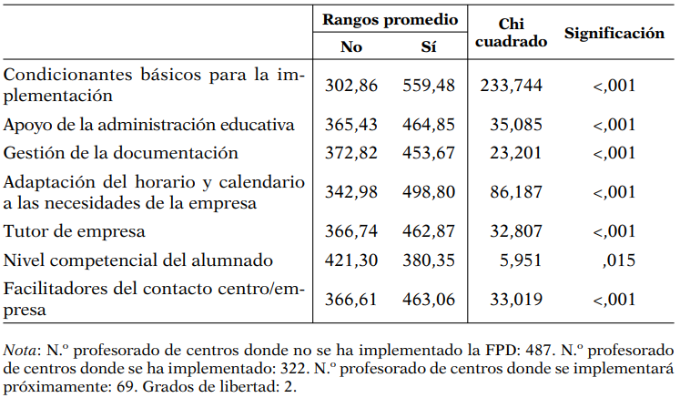 La prueba H (Tabla 7) nos informa de que todos los factores presentan diferencias significativas en función del estado de implementación de la FPD en los centros: los elementos que influyen en el desarrollo de la FP varían significativamente, en la percepción del profesorado implicado, según si en el centro se está actualmente desarrollando la FPD o no.