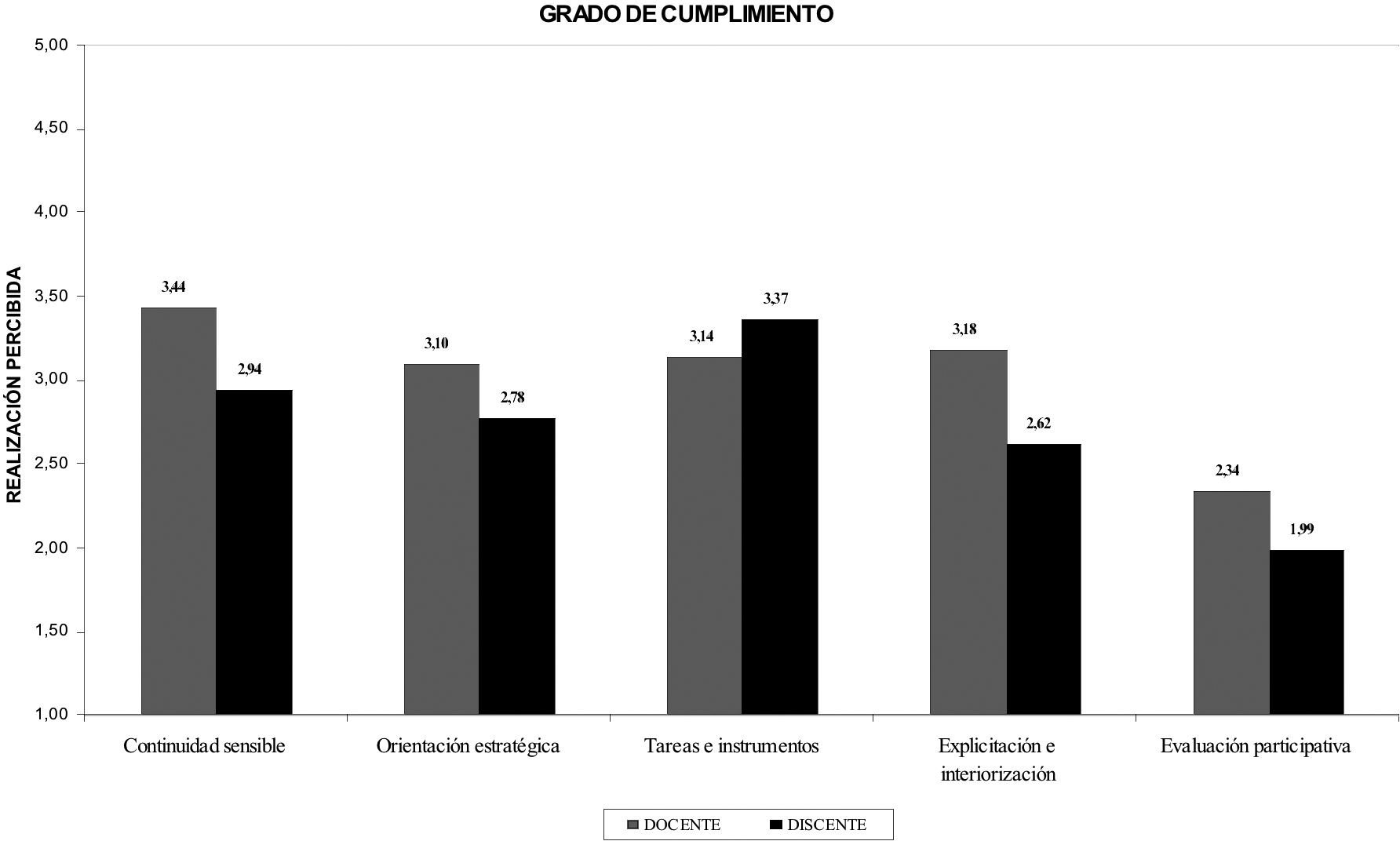 Dentro del patrón de respuesta descrito, las diferencias estadísticamente significativas detectadas son de tamaño pequeño y afectan únicamente al cumplimiento atribuido por ambas fuentes a los indicadores Evaluación participativa, Explicitación y clarificación y Continuidad sensible.