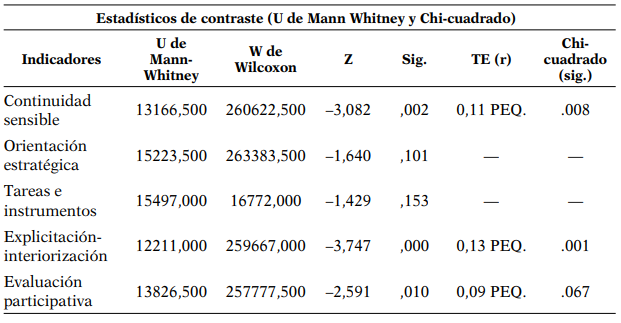 La U de Mann-Whitney revela diferencias estadísticamente significativas (p > .05) en tres de los indicadores considerados (ver Tabla 2), todas ellas sujetas a un tamaño de efecto pequeño.