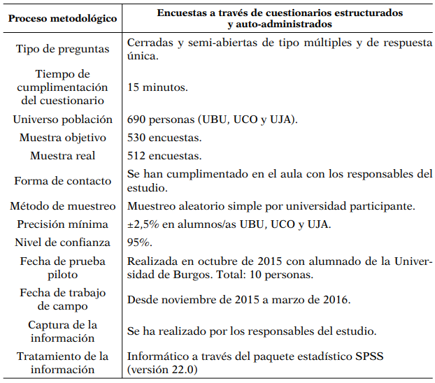 La fuente de información primaria empleada ha consistido en la recogida de datos por medio de un cuestionario dirigido a potenciales docentes que se encontraban en su fase de formación inicial. Concretamente la encuesta se dirigió a los alumnos del MFPES durante los meses de noviembre de 2015 a enero de 2016 en las Universidades de Burgos (UBU), Córdoba (UCO) y Jaén (UJA), la primera situada en el norte de España y las dos últimas en el sur, dado que, en un estudio de este tipo, la «posibilidad de captar la heterogeneidad es el principal valor añadido a la investigación de la cuestión en general» (Carabaña y de la Fuente, 2016, p. 987). Dichas universidades fueron seleccionadas, para formar parte de este estudio por su amplia tradición en la implantación del MFPES desde el curso 2009/10.