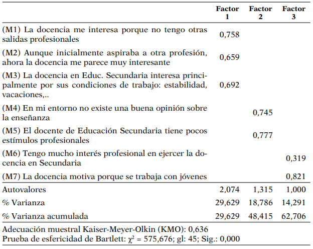 En la tabla 2, se presentan los resultados del análisis factorial sobre los ítems de motivaciones. El valor de Kaiser-Meyer-Olkin (KMO), que tiene en cuenta las correlaciones entre variables, es de 0,636 y está por encima del mínimo recomendable. Con este análisis factorial, los 7 ítems iniciales quedaron reducidos a tres factores. Estos resultados permiten intuir la existencia de tres tipos de factores motivacionales que animan o desaniman la elección de los estudios iniciales de formación del profesorado en enseñanza secundaria. El primer factor de la matriz de componentes rotados agrupa a las motivaciones relacionadas con las condiciones de trabajo que se esperan en una futura docencia, o a la consideración de la docencia como una posible salida laboral más. Se ha denominado «factores extrínsecos positivos», y explica el 29,63% de la varianza total. El segundo factor observado hace referencia a aspectos negativos relacionados con la opinión que, tanto el encuestado como los familiares o amigos, tienen sobre la imagen del docente en la sociedad y/o sus escasos estímulos profesionales. Este factor explica el 18,79% de la varianza total y se ha llamado «factores extrínsecos negativos». El tercer factor de la matriz de componentes rotados, con una varianza explicada del 14,29% de la varianza total, agrupa los motivos intrínsecos positivos docentes y las motivaciones altruistas. A este tercer factor se le ha denominado «factores intrínsecos».