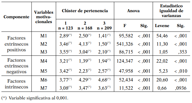 El análisis clúster determinó la existencia de tres tipologías distintas de estudiantes que pretenden ser profesores de educación secundaria. El primer conglomerado o clúster estaría compuesto por un total de 123 participantes (24,6% del total), y presenta las mayores puntuaciones en las variables M1 y M3 y niveles elevados para M2, que se corresponde a las variables de motivación extrínseca positiva hacia la docencia, pero también es el grupo que tiene, con diferencia, las mayores puntuaciones en los factores extrínsecos negativos (M4 y M5). A este grupo se le ha denominado alumnado con motivación circunstancial, ya que no tiene buena opinión de la docencia, y lo toma simplemente como una salida profesional viable. El clúster 2, compuesto por 168 participantes (33,6%), presenta la mayor valoración para la motivación M2 «aunque inicialmente aspiraba a otra profesión, ahora la docencia me parece interesante». Asimismo, este grupo se caracteriza por tener altas puntuaciones en los factores intrínsecos relacionados con la docencia, así como muy baja puntuación en los factores extrínsecos negativos, a este grupo se le ha denominado alumnado con vocación encontrada. Finalmente, el clúster 3, formado por 209 participantes (41,8%), presenta las puntuaciones más altas en las variables que conforman los factores intrínsecos, tanto para M6 como para M7, así como puntuaciones bajas tanto en los factores extrínsecos positivos como extrínsecos negativos, a este grupo se le ha denominado alumnado con vocación docente intrínseca.