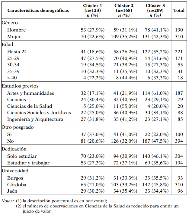 En cuanto a la presencia de la mujer en la docencia, es superior a la de los hombres (Azman, 2013). En consecuencia, también hay mayor presencia femenina en el máster, pero el género de los encuestados no influye en su adscripción a los grupos definidos previamente y, en consecuencia, se intuye que no existe una mayor vocación docente intrínseca según el género. Tampoco hay evidencia de que influya el origen geográfico del encuestado, ni el hecho de realizar otra actividad remunerada además de su formación en el máster.
