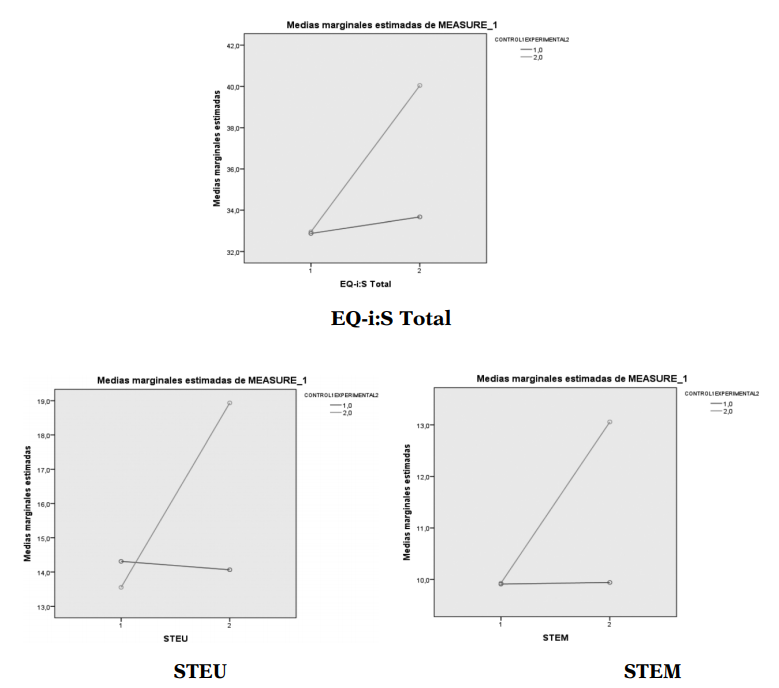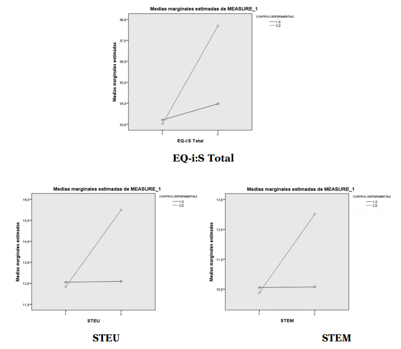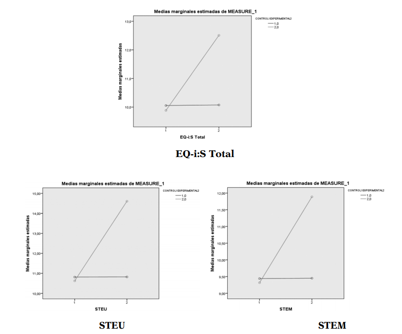 Las Figuras 1, 2 y 3 presentan los gráficos de interacción que ilustran las direcciones de las diferencias. El puntaje total del grupo experimental en las escalas EQ-i:S, STEM y STEU fue significativamente mayor una vez que el programa de intervención fue completado.