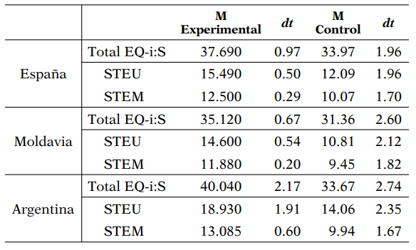 En primer lugar, para analizar si había diferencias en los niveles de IE en los dos grupos (experimental y control) de cada país antes de la intervención, se realizó un análisis de comparación de medias obtenidas en la fase pretest para las puntuaciones del factor EQi Total (en representación de todas sus subescalas); así como las puntuaciones en el STEU (comprensión de emociones) y en el STEM (manejo de emociones). Por favor, ver la Tabla 1.