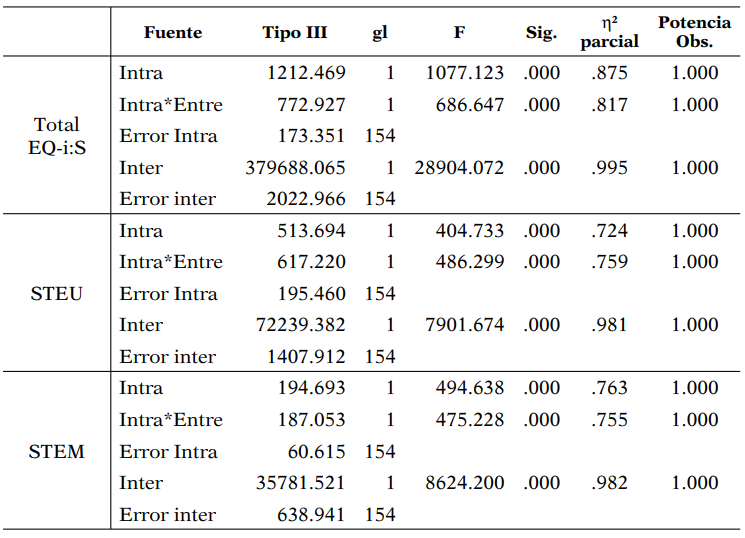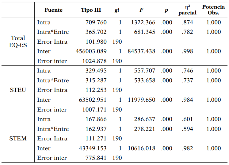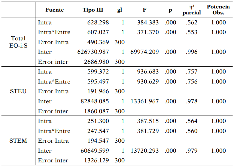 Se utilizó un modelo lineal general de medidas repetidas para evaluar la efectividad del tratamiento en la muestra. Las variables dependientes fueron los factores evaluados por el test STEM/STEU y el test EQ-i:S. Los resultados solo se muestran para las puntuaciones totales (Tablas 3, 4 y 5), pero fue significativo para todos los subfactores.