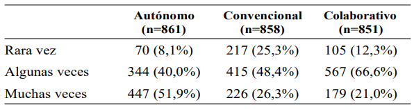 Se aplica un análisis factorial de componentes principales de máxima verosimilitud con rotación oblimin a la medida de las estrategias de aprendizaje, que arroja una solución en tres factores que explica el 64,95% de la varianza total (46,95% el factor 1; 14,4% el factor 2; 3,60% el factor 3). El análisis de la fiabilidad indica un alpha de Cronbach .85 para el factor 1 (convencional), .83 para el factor 2 (autónoma) y .84 para el factor 3 (colaborativa). Todos los ítems obtuvieron pesos factoriales superiores a .30 en el factor al que fueron asignados (tabla 2), tomando como criterio asignar el ítem al factor donde su peso fuera mayor. La eliminación del ítem 7 garantiza la validez de contenido, a la vez que aumenta la varianza explicada.