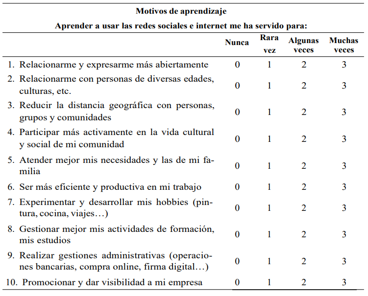 Con este artículo también mostramos una escala sobre los motivos que impulsan a las mujeres a aprender a usar las redes sociales, identificando usos generales como reducir la distancia geográfica, participar activamente en su comunidad y relacionarse con personas muy diversas, ya presentes en investigaciones previas, y motivaciones vinculadas a usos específicos asociados al desarrollo personal, cultural y profesional. Aunque existe abundante bibliografía previa sobre esta dimensión con aportación de medidas (Hew y Cheung, 2012; Yang y Brown, 2013), la mayor parte han sido realizadas con listas de control. Nuestro estudio no solo permite registrar las motivaciones presentes en el acercamiento a las redes sociales, sino también el grado en que esas motivaciones han impulsado el aprendizaje de las redes sociales. Por otra parte, como las investigaciones previas han mostrado (Hargittai, 2010; Livingstone y Helsper, 2007), es la heterogeneidad de motivos lo que incide en la alfabetización digital y no el tipo de motivación, habiendo documentado que son las personas que combinan diez o más motivos, las que muestran un mayor nivel de habilidad y autonomía digital. Con nuestra escala exploramos esa variedad siendo, a la vez, una escala viable y fácil de aplicar.