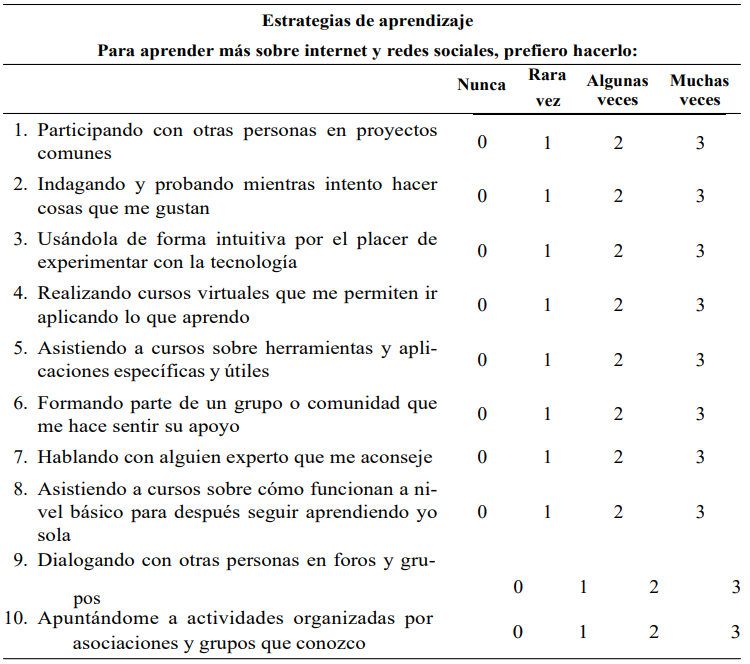 Partiendo de algunas aportaciones previas (Greenhow y Robelia, 2009; Gros, 2015; Jiménez-Cortés, 2015), definimos nuestra variable de estudio como «un proceso de adquisición de conocimientos y habilidades en el uso de internet y de las redes sociales, que emprenden las personas impulsadas por determinados motivos para lo cual emplean una variedad de estrategias y recursos a través de un amplio rango de contextos».