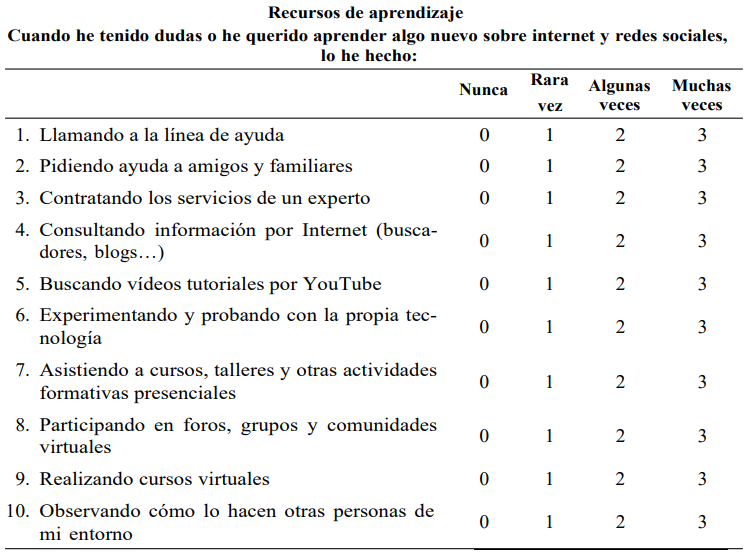 Los resultados preliminares de aplicación de estas escalas nos arrojan información de interés sobre la forma en que aprenden las mujeres sobre internet y redes sociales, siendo lo más significativo el uso de estrategias autodidactas en contextos informales y con apoyo en la ayuda de su entorno más inmediato de amigos y familiares o de la propia tecnología consultando información por internet o videotutoriales. La realización de cursos y la ayuda de personas expertas es una opción empleada de forma ocasional y puntual. Investigaciones previas realizadas con metodologías cualitativas también obtienen resultados similares (Sánchez-Vadillo et al., 2012; Vega et al., 2015; Vergés et al., 2011).
