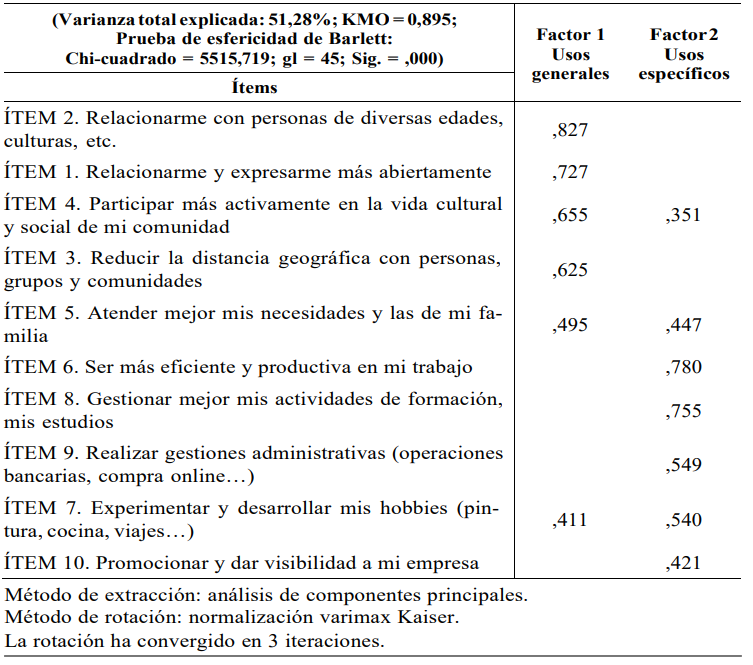 Se aplica un análisis factorial de componentes principales de máxima verosimilitud con rotación Varimax a la medida de motivos de aprendizaje de las redes sociales que arroja una solución en dos factores que explica el 51,28% de la varianza total (26,61% el factor 1; 24,67% el factor 2). El análisis de la fiabilidad indica un alpha de Cronbach .83 para el factor 1 (usos generales) y .82 para el factor 2 (usos específicos). Todos los ítems obtuvieron pesos factoriales superiores a .30 en el factor al que fueron asignados (tabla 1), tomando como criterio asignar el ítem al factor donde su peso fuera mayor.