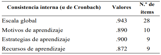 Los valores de consistencia interna tanto de la escala global como de las tres escalas son aceptables como refleja la tabla 4. De esta forma, podemos afirmar que tanto la escala global como las tres escalas que incluye poseen índices de fiabilidad o consistencia interna altos al alcanzar coeficientes alpha de Cronbach que están por encima de .88.