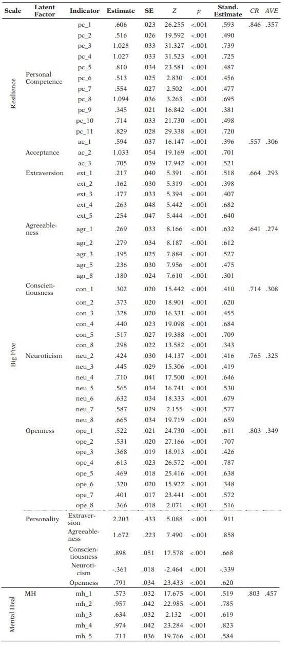 Before the treatment of the data obtained with the scales, the validity and internal consistency of the scales were verified by Confirmatory Factor Analysis. Confirmatory Factorial Analysis (CFA) were conducted with the lavaan R package. Diagonally weighted least squares (DWLS) was used as estimation method for CFA to account for multivariate non-normality. Cronbach’s alpha and McDonald ω were used to assess reliability (Revelle, 2019). The fit indices used in CFA and Mediation (and goodness of fit) were Comparative Fit Index (CFI; >.95 great; >.90 acceptable), Tucker- Lewis Index (TIF; >.90), Standardized Root Mean Square Residual (SRMS; >.09), and Root Mean Square Error of Approximation (RMSEA; >.05 good; <.05-.10 moderate) with 90% of Confident interval. The semTools package was used to calculate the Composite Reliability (CR; >.7 great) and the Average Variance Extracted (AVE; >.5 great). Once the factorial treatment was done to the results of the scales, the scores given by the participants were scaled by the factor load resulting from the CFA. In other words, the raw scores given by the participants to each item were multiplied by the standardized factor loads of each item. A mediation analysis was conducted to analyze how resilience could mediate the relationship between the different personality factors and mental health. Due to the scaling of the variables used in the Mediation analysis, all the coefficients are estimated using Maximum Likelihood method implemented in the lavaan R package. The betas are obtained as standardized parameters of the path model. They are often called completely standardized effect size indexes. For the indirect effect, the beta is also called index of mediation.