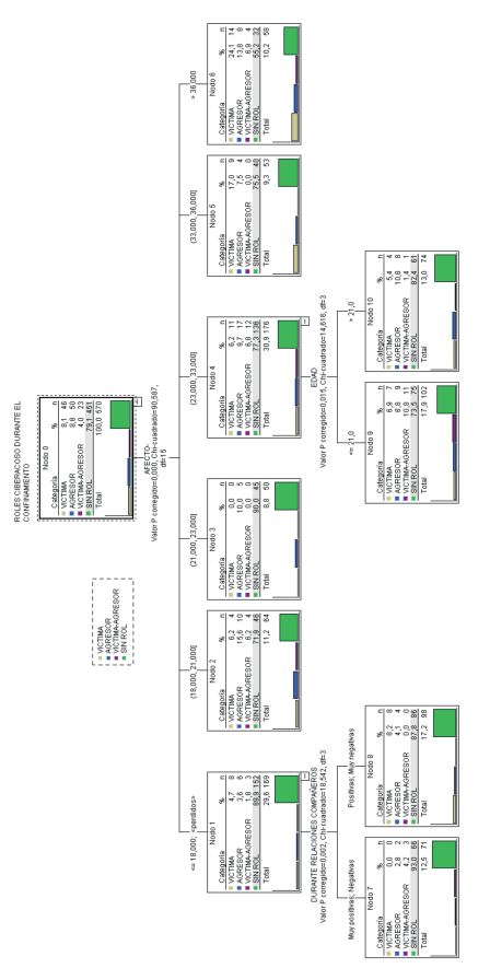 En el análisis de los datos se utilizó el programa estadístico SPSS versión 24.0 para Windows, con un margen de error del 5% y un nivel de confianza del 95%. Para conocer la distribución de los resultados se calcularon las frecuencias y porcentajes. Para determinar el rol de cada participante en el ciberacoso, siguiendo las indicaciones de Polo et al. (2017), se calcularon los percentiles de las escalas CyB-VI y CyB-AGRES, y se estableció como punto de corte para determinar la mayor implicación en el rol el percentil 75. Al igual que en los estudios previos se encontró que había participantes que se podían incluir en varios roles, por lo que se realizó un análisis discriminante, para predecir a qué grupo era más probable que perteneciera cada participante. Para establecer si había diferencias estadísticamente significativas entre los roles antes y después del confinamiento se realizó la prueba chi-cuadrado de Pearson (c2). Para conocer qué variables predictoras (sociodemográficas, académicas, afectivas y sociales) influían en cada rol antes y durante el confinamiento (variable criterio) se calculó un modelo de clasificación mediante árboles de decisión utilizando método de división CHAID. Para estudiar las comparaciones entre grupos en los afectos, los relaciones con los iguales y el uso de Internet, se realizó la prueba no paramétrica Kruskal-Wallis, dado que los datos no presentaron una distribución normal (Kolmogorov-Smirnov <.05), así, como el análisis de estimación del tamaño del efecto, mediante el cálculo de la g de Hedges (.04: mínima necesaria, .25: moderada, .64: fuerte).