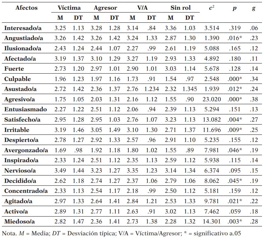 Sánchez, V., Ortega, R., & Menesini, E. (2012). La competencia emocional de agresores y víctimas de bullying. Anales de Psicología, 28(1), 71-82 https://bit.ly/2TpAgm9