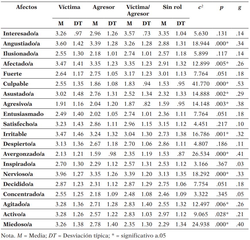 La prueba de Kruskal-Wallis para los afectos durante el confinamiento mostró diferencias estadísticamente significativas (Tabla 2). Las víctimas se sintieron más afectadas, asustadas, nerviosas, irritables y agitadas que los participantes sin rol; y más activas que los agresores. Los participantes sin rol fueron los que menos angustiados se sintieron en comparación con las víctimas y los agresores; y los que menos culpables se mostraron frente a los agresores y las víctimas/agresores. Los agresores fueron los que más agresividad manifestaron comparados con los estudiantes sin rol. Las víctimas/agresores y los participantes sin rol se mostraron menos miedosos que las víctimas. Los agresores y los participantes sin rol fueron los que menos avergonzados se sintieron comparados con las víctimas.