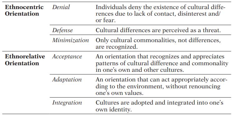 IS could be seen in terms of stages of personal growth. The DMIS suggests that individuals move through six stages based on how people perceive and respond to cultural difference (Table 1). The first three stages: denial, defense, and minimization are considered ethnocentric. Individuals view their own culture as central to all reality and act by avoiding cultural differences through denying their existence, raising the defense against their differences and minimizing their importance. The following three stages: acceptance, adaptation and integration are considered ethnorelative (a tendency to prefer members of the endo-group). In the ethnorelative view, difference is not perceived as a threat but as a challenge, and people become more sensitive to cultural differences through accepting their importance, adapting a perspective to take them into account or by integrating the whole concept into a definition of identity. In short, people become more sensitive to cultural differences, which means that their own culture is experienced within the context of other cultures until they recognize other cultures as equally valid.