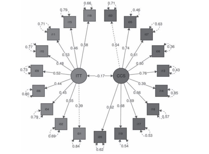 En primer lugar, se realizó el análisis con el constructo teórico inicial del ATI. Tras separar ambas escalas revisamos la fiabilidad, obteniendo unos resultados adecuados. Para la escala CCS un alfa ordinal =.87 y ωt =.87. En el caso de la escala ITT obtenemos un alfa ordinal =.72; y ωt =.74. La relación entre ambas escalas es negativa baja (-.15) pero significativa. El índice de ajuste de este modelo es aceptable (χ²(169) = 674.68, p <.001, CFI=.936, TLI=.928, RMSEA=.07). No obstante, aunque el modelo obtiene un ajuste aceptable, se decide eliminar el ítem 12 dado que aporta muy poco al factor ITT. Como consecuencia, los índices mejoran de forma sensible (χ²(151) = 478.93, p <.001, CFI=.957, TLI=.951, RMSEA=.059). En el caso de la fiabilidad, para la escala CCS seguimos obteniendo un alfa ordinal =.87 y ωt =.87. En el caso de la escala ITT mejoramos hacia un alfa ordinal =.74; y ωt =.75. En la Figura 1 se muestra la representación gráfica del modelo. La relación entre ambas escalas es negativa, significativa, pero con una carga factorial baja (-.17). No existe un continuo único bipolar entre el enfoque basado en la materia y enfoque basado en el alumnado. La preferencia por uno u otro funciona como un binomio de dos factores distintos y poco dependientes, de forma que pueden observarse personas que prefieren los ítems de un factor, pero no por eso rechazan los ítems del otro factor. Estos resultados son similares a los obtenidos en otros trabajos en los que se han analizado las propiedades métricas y la estructura factorial de la escala ATI (Monroy et al., 2015; Prosser y Trigwell, 2006).