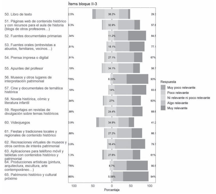 En el lado opuesto, los recursos que el futuro profesorado de historia considera menos adecuados (debajo de 3.5 de valoración) son el libro de texto (Ítem 50), con un 2.61 y los videojuegos (Ítem 60), con un 3.24. Por último, recursos digitales y de mass-media, como páginas web de contenido histórico (3.61) o aplicaciones para teléfono móvil y tabletas con contenido histórico (3.65) tienen una valoración moderada, igual que los apuntes del profesor (3.64). Los recursos relacionados con el patrimonio (museos, patrimonio próximo, producciones artísticas, recreaciones virtuales en museos...) y los de carácter procedimental (fuentes documentales y orales), tienen una valoración más alta. Los recursos digitales tienen una valoración más baja, excepto el uso del cine y las recreaciones virtuales en museos.