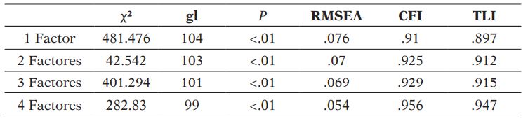 Para establecer los índices de ajustes del modelo se utilizan los valores de TLI (Tucker-Lewis Index), también conocido como NNFI (Non-Normed Fit Index) y de CFI (Comparative Fit Index), que toman valores entre 0 y 1, indicando un buen ajuste aquellos valores cercanos a 1 (Kenny, 2012). Por otra parte, el valor de RMSEA (Root Mean Square Error of Approximation) mide la diferencia absoluta entre la estructura de relaciones, entre el modelo teórico propuesto y los datos observados, teniendo en cuenta el número de estimadores y el tamaño muestral (Steiger, 1990); tomando valores entre 0 y 1, indicando un buen ajuste aquellos valores cercanos a 0.